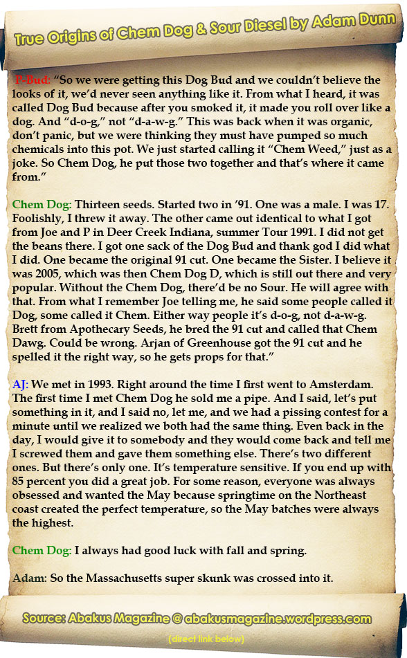 In the article True Origins of Chem Dog and Sour Diesel by Adam Dunn, Adam interviews those involved in the evolution of Sour diesel: