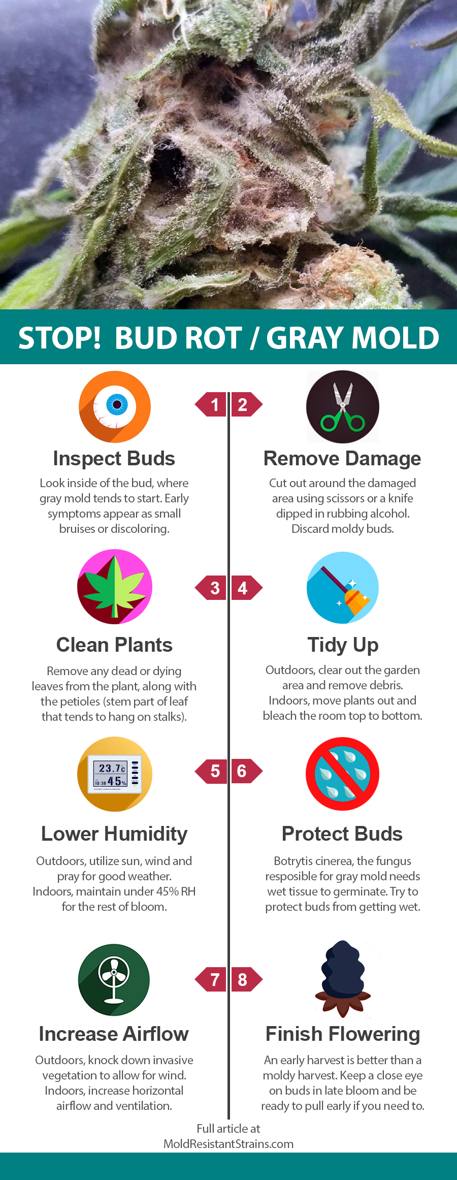 Tropical sativa strains are highly resistant to gray mold. These mold resistant strains have often developed the resistance naturally, through many generations of growing in wet, humid climates. Their airy buds allow air to flow within, and damaged buds tend only to turn brown and rot instead of harboring gray mold.